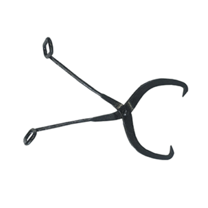 Tenaza para durmiente de Madera para dos personas, apertura de las quijadas 4″ mínimo – 15-1/2″ máxima, largo de los brazos en posición horizontal 3`-8″. Se prueban 3 pares de tenazas de cada lote de 10 docenas o menos suspendiendo una carga de 300 lb o 400 lb trabajando las pinzas con las asas en posición horizontal y soportada 2″ desde el extremo. La deflexión con 300 lb de peso no debe exceder de 1″ sin la carga permanente y con 400 lb la deflexión no debe superar 1-1/4″ y con la carga permanente no debe exceder 1/8″ más. Fabricada con acero de contenido de carbón 0.55 a 0.70, contenido de manganeso 0.60 a 0.90, fósforo 0.05, azufre 0.05. Ultima revisión Plan #8-10 de AREMA.